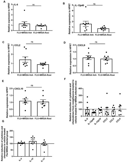 Rosiglitazone treatment does not affect production of inflammatory cytokines and chemokines during influenza-bacterial super-infection. WT mice were infected with influenza or PBS for 6 days then challenged with MRSA for one additional day, and harvested one day after MRSA infection. Mice were treated with rosiglitazone or vehicle (DMSO) from day 0–6 of influenza infection or PBS treatment, (N = 7–8 per group). (A–E) IL-6, IL-12p40, CCL2, CXCL9 and CXCL10 expression levels were measured by RT-PCR, N = 7–8 per group. Relative induction of (F) IL-6, IL-12p40, IL-12p70, CCL2, CCL3, and CCL4 (G) IL-4, IL-10 and IL-13 levels in response to rosiglitazone-treated to vehicle-treated group by Luminex assay N = 7–8 per group, Data are represented as mean ± SEM, ns-not significant.