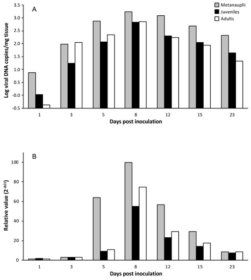 During the course of the experimental infections, particularly in those performed with metanauplii and juveniles, brine shrimps kept growing, doubling or tripling in size, and completed their life cycle, becoming adults. Thus, viral loads expressed per mg of tissue are difficult to interpret, and do not reflect actual viral loads per individual. Taking this into account, the number of genome copies probably increased in each brine shrimp specimen during the experimental trial.