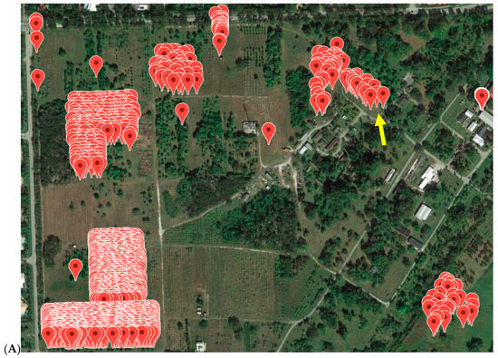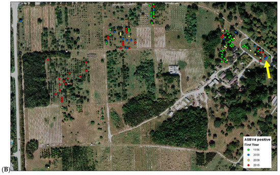 (A) Location of all avocado trees on the SHRS station and (B) location and first detection of ASBVd positive avocado trees on the SHRS station. Yellow arrow points to “Avocado Circle”.