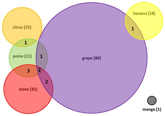 Banana trees (banana and plantain), citrus fruit trees (orange, lemons, limes, grapefruit, and tangerine), pome fruit fruits (apple, quince, and pear), grapevines, mango trees, and stone fruit trees (peach/nectarine, apricot, plum, almond, and cherry) have a global production of 147.33, 108.01, 74.28, 129.76, 50.64 and 43.13 million metric tons, respectively, according to the statistical data published in 2017 (Statista Global Consumer Survey, provided by Statista GmbH, Hamburg, Germany). The total production of these fruit trees is 553.15 million metric tons and accounts for 86.55% worldwide, illustrating their major significance.