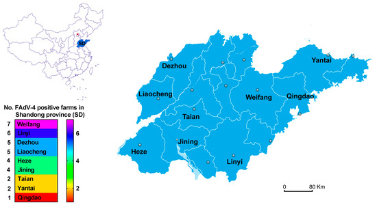 In this study, a total of 679 animal cases were collected from 36 suspected FAdV-4-infected farms in Shandong province. Of the 679 samples, 443 (65.24%) tested positive for FAdV-4 nucleic acid (Table 2). The spatial distribution is described in Figure 1. FAdV-4 has been circulating in more than half of the cities in Shandong province (nine of 16).