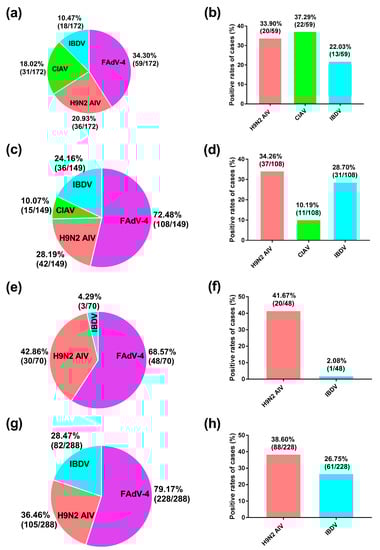 Co-infection by other viruses and FAdV-4 in tested samples. Note: (a,c,e,g) Pie charts showing the rates of infection of FAdV-4, H9N2 AIV, CIAV, and IBDV in the total population of the sampled fowl (n = 679) sub-grouped by species and farming purpose as breeder chickens (a), commercial chickens (c), breeder ducks (e), and commercial ducks (g). (b,d,f,h) Co-infection rates for the 443 FAdV-4-infected sample animals with H9N2 AIV, CIAV (chickens only), and IBDV. Abbreviations: CIAV: chicken infectious anemia virus; FAdV-4: fowl adenovirus serotype 4; H9N2 AIV: H9N2 avian influenza virus; IBDV: infectious bursal disease virus.