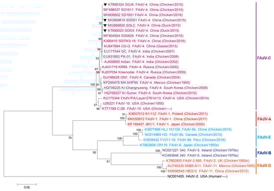 Phylogenetic analysis of the hexon gene sequences of the four representative FAdV-4 strains (i.e., SDJX, SDLC, SDSX, and SDD01) isolated in Shandong province (Figure 3) showed that they were mainly clustered in the FAdV-C group (e.g., GC and PK-01 strains), which were isolated in India.