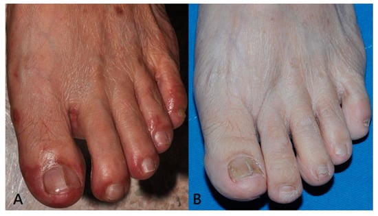 (A) In the acute stage, the cutaneous lesions, such as erythematous papules and pustules, around the nail matrix of the first, fourth and fifth toenails of left foot are relatively prominent than on the second and third toe; (B) about two months later, onychomadesis on the second and third toe of left foot.