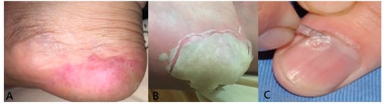 - Chiu, H.H.; Wu, C.S.; Lan, C.E. Onychomadesis: A Late Complication of Hand, Foot, and Mouth Disease. J. Emerg. Med. 2017, 52, 243–245. [Google Scholar] [CrossRef] [PubMed]