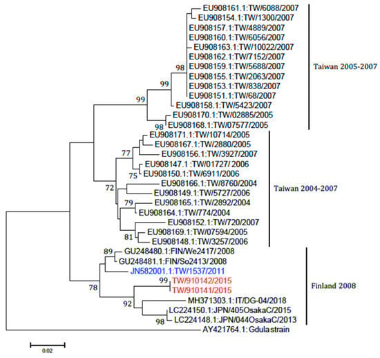 Phylogenetic analysis of Coxsackievirus A6 strains. The partial VP1 gene sequences (377 nucleotides) of our A6 strains (TW/910141 and TW/910142 in red) and the strains in Taiwan from 2004 to 2011 along with six sequences obtained from Genbank (two from Finland, two from Japan, one from Italy, and the prototype strain, Gdula) were used for the phylogenetic analysis. One strain (highlighted with blue) is identical to Finland strain we published in 2013.