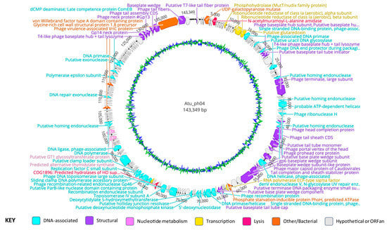 Genome annotation of Atu_ph04, color-coded by functional annotation. G + C content represented by inner circle: AT = green; GC = blue.