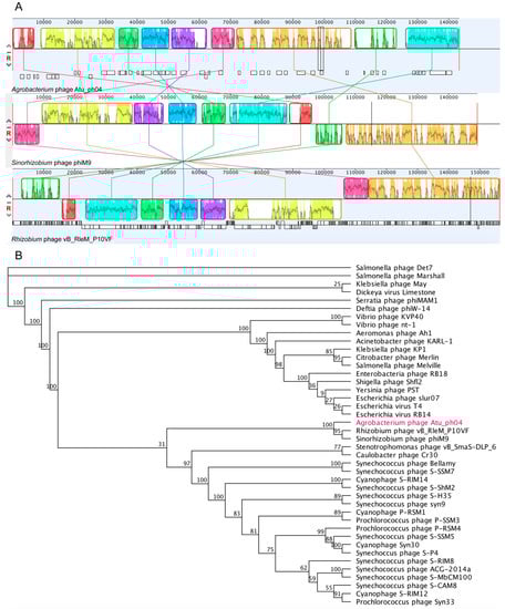 Phylogenetic analysis of Atu_ph04 with its relatives. (A) Mauve genome alignment of Atu_ph04, Sinorhizobium phage phiM9, and Rhizobium phage RleM_P10VF. (B) Phylogenetic tree of portal vertex protein.
