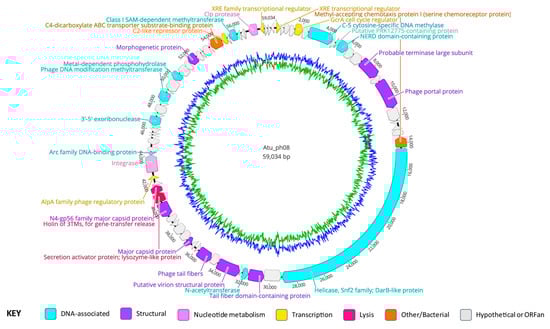 Genome annotation of Atu_ph08, color-coded by functional annotation. G + C content represented by inner circle: AT = green; GC = blue.