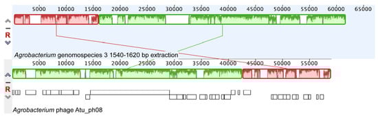 The genome of Atu_ph08 shares most of its genes with A. tumefaciens and Rhizobium species, leading us to hypothesize that Atu_ph08 and the Alphaproteobacteria have exchanged genes through horizontal gene transfer. Furthermore, the G + C content of the genomes of A. tumefaciens and phage Atu_ph08 are similar (~59%), in contrast with the G + C content of the other Agrobacterium phages, which are all lower. An initial analysis of the Agrobacterium genomospecies 3 strain CFBP 6623 genome (Accession number: NZ_LT009723) reveals the existence of three intact prophage regions and one incomplete prophage at the 1.5 million bp []. Mauve genome alignment of Atu_ph08 with this region in Agrobacterium genomospecies 3 strain CFBP 6623 (1,555,808–1,601,554 bp) revealed a 60.2% pairwise identity between the genomes (Figure 5).