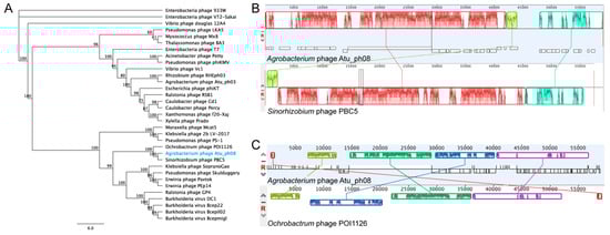 Relatives of Atu_ph08. (A) Phylogenetic tree of large terminase protein. Mauve genome alignment of Atu_ph08 with (B) Sinorhizobium phage PBC5 and (C) Ochrobactrum phage POI1126.