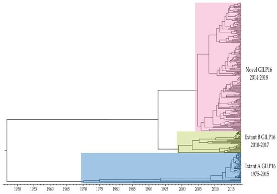 - Drummond, A.J.; Rambaut, A. BEAST: Bayesian evolutionary analysis by sampling trees. BMC Evol. Biol. 2007, 7, 214. [Google Scholar] [CrossRef]