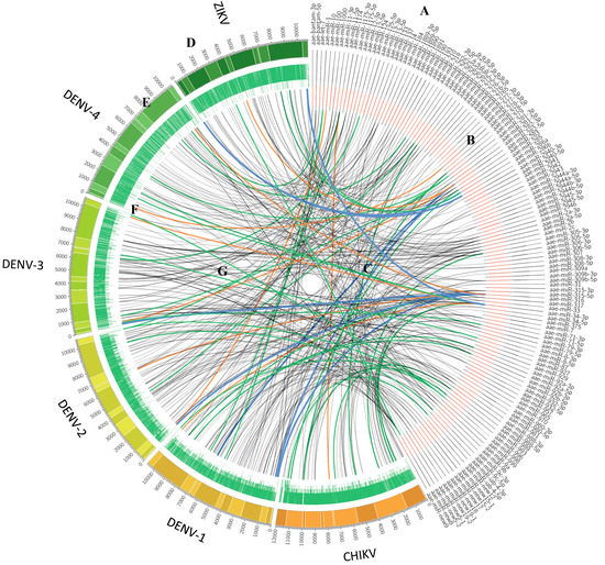 The interactome of Ae. aegypti micro RNAs (miRNAs) with chikungunya virus (CHIKV), Dengue virus (DENV), and Zika virus (ZIKV) genomes as predicted by miRanda and TargetSpy. (A) miRNAs of Ae. aegypti; (B) miRNA and its seed regions (seed regions in red); (C), links between miRNAs and potential binding regions on the viruses; (D) genomes of arboviruses; (E) dark and light areas represent the protein coding regions in each virus; (F) conservation scores of virus among all the genotypes; green links, the miRNA binding site shared among most of the genotypes discussed in this study; orange links, the miRNA-viralRNA (vRNA) with low energy; blue links, the miRNA-vRNA with low energy shared among most arboviruses; black links, remaining miRNA-vRNA interactions.