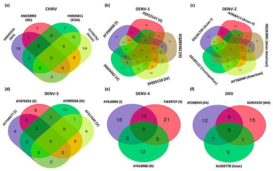 Venn-diagram presentation of common prediction binding sites on each genotype/lineage of CHIKV, DENV1–4, and ZIKV for Ae. aegypti miRNAs (a–f). miRNAs that were sorted by the conservation of target sites that might show a more general miRNA-vRNA interaction. (a) AM258992, Indian Ocean Lineage, IOL; HM045816, West African, WA; EU703762, Asian; HM045811, East/Central/South African, ECSA; (b) AF298808, genotype I; JQ922547, genotype II; DQ285562, genotype III; EF025110, genotype IV; JX669462, genotype V; (c) DQ181799, Asian-I; AJ968413, Asian-II; DQ181801, Asian American; AY702040, American; AB189122, Cosmopolitan; (d) AY744677, genotype I; AY676352, genotype II; AY099336, genotype III; AF317645, genotype V; (e) AY618992, genotype I; FJ639737, genotype II; AY618988, genotype III; (f) KF268949, East African, EA; KU955592, West African, WA; KU365778, Asian. The numbers with an asterisk represent the miRNA binding sites; the most common in each virus group were listed in Supplementary Table S1.