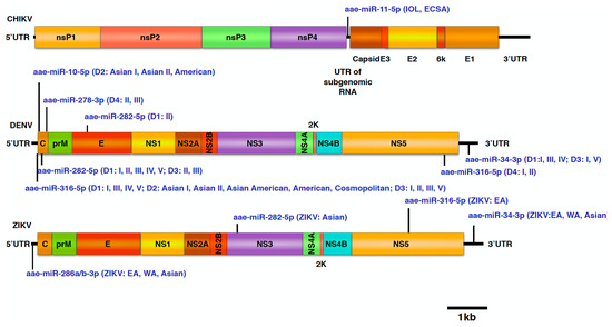 - Dubey, S.K.; Shrinet, J.; Jain, J.; Ali, S.; Sunil, S. Aedes aegypti microRNA miR-2b regulates ubiquitin-related modifier to control chikungunya virus replication. Sci. Rep. 2017, 7, 17666. [Google Scholar] [CrossRef] [PubMed]