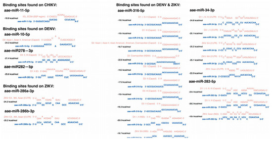 Possible structures of each low MFE miRNA-vRNA interaction predicted by RNAhybrid. The structures of seven low MFE miRNAs of Ae. aegypti potentially interact with CHIKV, DENV, and ZIKV. Among them, the possible binding sites for aae-miR-316-5p and aae-34-3p, and aae-miR-282-5p could be commonly found on both DENV and ZIKV. Sequence in red: the potential targets in RNA genome of each virus; sequence in blue: cellular miRNAs of Ae. aegypti.