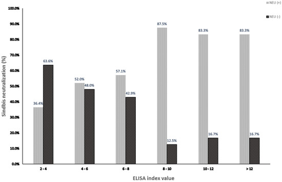 Neutralization of SINV ELISA IgG-positive samples. Serum neutralization assay was performed on 113 samples positive in the ELISA assay for SINV IgG. The samples were divided into six groups based on the ELISA index value. Percentages of samples neutralized by SINV [NEU (+)] or not [NEU (-)] are depicted.