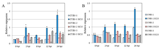 Analysis of mRNA levels of CYB5 isoforms in soybean. Relative mRNA levels of GmCYB5 isoforms in (A) susceptible plants (cv. NN1138-2) or (B) resistant plants (cv. RN-9) with or without SMV (SC15) infection. Samples are collected at 0, 2, 8, 12, and 24 h post infection (hpi) and quantified by qRT-PCR. Error bars indicate SD (n = 3). Asterisks denote the significant difference between pathogen-treated and control plants for each respective isoform, t-test, p < 0.001. Results are representative of two–three independent experiments.