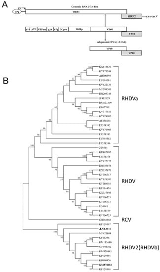 3.2. Complete Genome Sequence and Phylogeny of RHDV2 Isolate NL2016