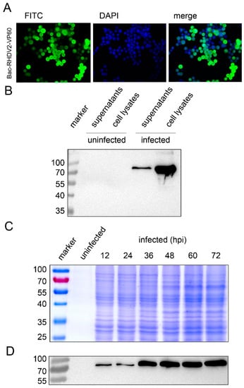 An indirect immunofluorescence assay (IFA) using anti-his antibodies showed that VP60 accumulated to high levels upon transfection of bacmid DNA (Figure 2A). Supernatants and lysates of infected cells were separately collected after 3 days post infection (dpi) with plaque purified, passage 5 (P5) virus stocks. Next, VP60 expression was confirmed by western blot analysis using His-tag specific antibodies. The expected molecular mass of recombinant His-VP60 is approximately 70 kDa (Figure 2B). Both the supernatant and cell lysates were positive, with more protein present in the cell lysate. Next, Sf9 cells infected with Bac-RHDV2-VP60 at an MOI of 10 and both the culture fluid and cells were collected, lysed by sonication and clarified by low-speed centrifugation to remove cell debris. After ultracentrifugation, the pellet was resuspended in PBS and the expression level of RHDV2-VLPs was checked by SDS-PAGE (Figure 2C) and western blot (Figure 2D). RHDV2-VLPs could be detected on western blots as early as 12 hpi (Figure 2D), but the highest expression level was observed at 60 hpi (Figure 2C).