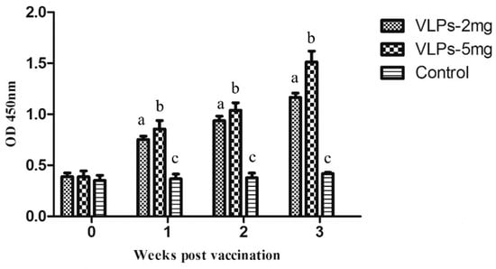The RHDV2 VLPs were then used to immunize rabbits. Groups of five rabbits were immunized subcutaneously with different dosages of VLPs or with control antigen. Serum was collected every week and RHDV2-specific antibodies in immunized rabbits were detected by indirect ELISA assays. The antibody titers of rabbits immunized with VLPs were shown to increase with time and are statistically different from the control group. As expected, the antibody titers in rabbits immunized with 5 mg VLPs are a little higher than those immunized with 2 mg VLPs (Figure 4).