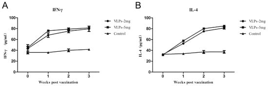 The level of cytokines at weeks 0, 1, 2 and 3 post-immunization was examined to investigate the efficiency of the cellular immune response induced by VLPs. Therefore, the serum collected above was used to determine the levels of the Th1-Type I related cytokine IFN-γ, while IL-4 levels were measured to check for Th2-type 2 cytokines. Commercial Elisa Kits (R&D Minneapolis, MN, USA) were used for these assays.
