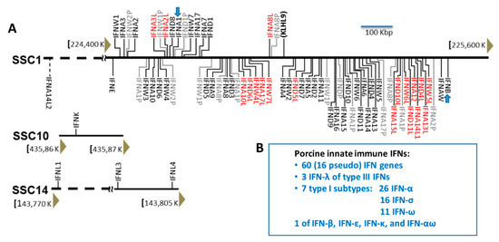 The pioneer studies about porcine IFNs (primarily IFN-α/β) detected the IFN-mediated broad-spectrum antiviral activity in sera, intestinal homogenates, and cell culture supernatants that were collected from virus-infected or poly (I:C)-treated pigs and porcine kidney cells [19,20]. This innate antiviral activity was further characterized as secreted peptides bearing the properties of being acidic (pH at ~2.0) stable, relatively heat stable, and host-species specific [19,20]. Correspondingly, type I IFN gene loci were located on swine Chromosome 1 using in situ hybridization [21], and genetic pieces containing IFN genes coding ten IFN-α [22], three IFN-ω [23], and one IFN-β [24] were isolated and cloned in later years. Another unique IFN subtype in pigs, short porcine type I interferons (spI IFNs and subsequently named IFN-δ), which were encoded by the genes physiologically expressed by trophoblasts during implantation, were also studied [25,26]. Together, the molecules within four subtypes (i.e., IFN-α/β/δ/ω) of porcine IFNs were partially identified and studied prior to the initiation of Swine Genome Project [19,20,21,22,23,24,25,26]. We now know that IFN-λ represents a major antiviral player in gut epithelia; therefore, the IFN-mediated antiviral activity in the porcine intestinal homogenates should be, at least partially, ascribed to type III IFNs, which were unfortunately overlooked previously [20,27,28,29,30,31,32]. As for the other porcine IFN subtypes including IFN-ε/κ/αω, we have only been able to appreciate their molecular existence after genome-wide examination [5,33]. Associated with the swine genome project and the USDA coordination in comparative annotation of livestock immune genes (immunome) [6,7], we have determined, family-wide, the molecular composition of porcine IFN complex, which includes 60 functional genes in total plus about 20 pseudogenes [5,6,7,27,33]. To our knowledge, this is the highest IFN gene number in one species (paralleled by domestic cows) of all animal species studied so far (Figure 1 and Figure 2).