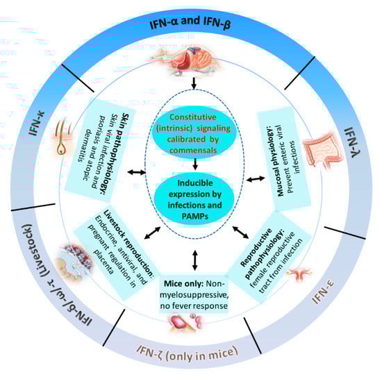 This is to say that the increasing pathogenic pressure due to crowded conditions, interspecies mixing, and transmission during domestication (especially from intracellular pathogens like viruses) comprises a major factor driving antiviral IFN expansion. Because of the coordination between the immune system and other physiological systems for metabolism, endocrine, and reproduction some new functions per metabolic and reproductive regulation could be extended (and even originated) from the newly emerging IFNs in livestock [1,2,3,4]. Significant examples are bovine IFN-τ and porcine IFN-δ, which are determined to have a hormonal role in animal reproduction in addition to their antiviral properties [45,46].