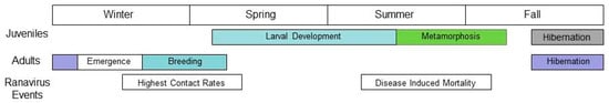 - Brunner, J.L.; Schock, D.M.; Davidson, E.W.; Collins, J.P. Intraspecific reservoirs: Complex life history and the persistence of a lethal ranavirus. Ecology 2004, 85, 560–566. [Google Scholar] [CrossRef]