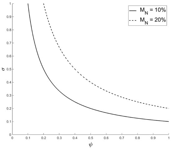 The interaction between σ and Ψ, under which Ro ≥ 1, when AS = 99 and an MN = 20% (upper dashed-curve) and when the initial conditions of AS = 49 and an MN = 10% (lower curve), where Ψ is the contact rate and σ is the likelihood of transmission for the model.