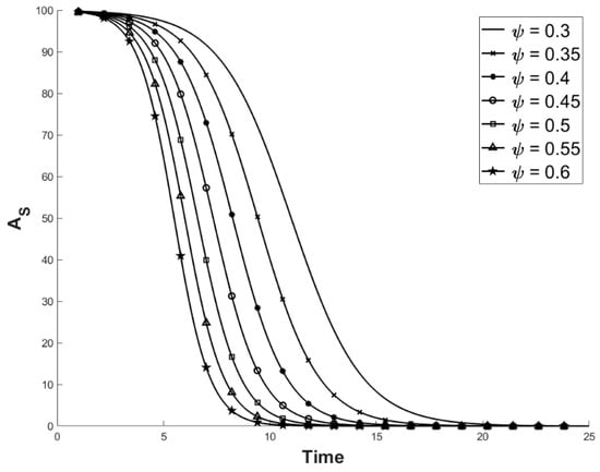 Predicted values of AS with varying values of Ψ while other values remained constant at: σ = 0.3; MN = 0.2; and MD = 0.75. The starting population composition is AI = 1 and AS = 99 and time is in years. AS is the number of susceptible individuals, Ψ is the contact rate, σ is the likelihood of transmission, MN is the natural mortality rate, and MD is the mortality rate associated with ranavirosis.