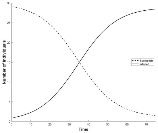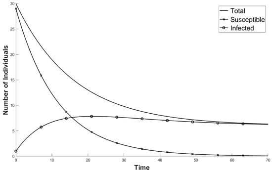 Since ranaviruses have emerged recently in the UK, and common frogs and the severity of the disease is affected by climate change, it is unlikely that the disease dynamics have reached an equilibrium ([27,28]; Figure 4). Using an estimated σ of 0.3 (from data from Table 1), an average MD of 0.775, an average Ψ value of 0.45, and an Atotal of 30 [9] with the initial conditions of an As of 29 and an AI of 1, we found that the interaction between AS and AI requires greater than 60 years to stabilize to post-epidemic dynamics (Figure 5). These results suggest that, under the present conditions, ranavirus in populations of common frogs can be sustained entirely through adult–adult transmission.