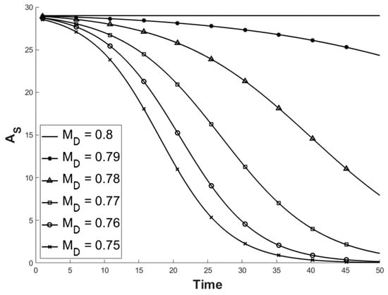 Illustration of the predicted values for AS with different disease-induced mortality rates, while other values remained constant at: Ψ = 0.45; σ = 0.3; MN = 0.2; the starting population comprised of AI = 1 and As = 29. As is the number of susceptible individuals, Ψ is the contact rate, σ is the likelihood of transmission, MN is the natural mortality rate and MD is the mortality rate associated with ranavirosis.