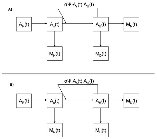 Diagrammatic representations of the transmission dynamics of the ranavirus when only the AS or AH causing isolate of the ranavirus is present. (A) When only the ulcerative form of the ranavirus is present within the population. (B) When only the hemorrhagic form of the disease is present in the population. All of the variables present are the same as described above and all have a time component associated with them. Where As is the number of susceptible individuals, Ψ is the contact rate, σ is the likelihood of transmission, MN is the natural mortality rate, and MD is the mortality rate associated with ranavirosis.