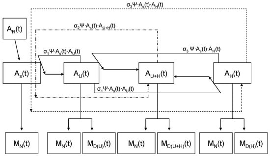 AU(t) = AU(i) + [σ1Ψ·AS(i)·AU(i)] − [σ1Ψ·AU(i)·AH(i) + σ3Ψ·AH(i)·AU(i)] − [MN(i) + MD(U)(i)]
