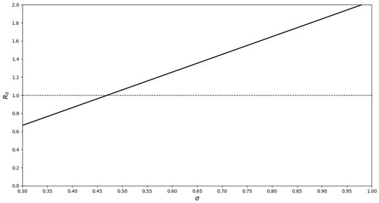 Ro values for the introduction of one AH individual into a population of AS = 28 and AU = 1 (MD(U) = MD(H) = 0.775, Ψ = 0.45, MN = 0.2). AS is the number of susceptible individuals, Ψ is the contact rate, σ is the likelihood of transmission, MN is the natural mortality rate, and MD is the mortality rate associated with ranavirosis.