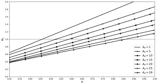 Ro values for the introduction of one AH individual to populations with differing numbers of AU, while the total population size remains constant at 30. The number associated with each line indicates the number of AU individuals present in the population. (MD(U) = 0.775, Ψ = 0.45, MN = 0.2) As is the number of susceptible individuals, Ψ is the contact rate, σ is the likelihood of transmission, MN is the natural mortality rate, and MD is the mortality rate associated with ranavirosis.