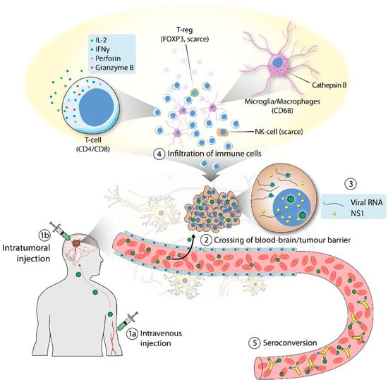 Clinical trial of H-1PV in patients with glioblastoma. (1) H-1PV was administered intratumorally (a) or intravenously (b). (2) H-1PV injected intravenously reached the brain tumor by crossing the blood–brain barrier. (3) H-1PV successfully infected cancer cells, which were positive for viral RNA and NS1 protein (although NS1 expression was below detection limits when the virus was given intravenously). (4) H-1PV induced immunoconversion of the tumor microenvironment (TME), which was characterized by infiltration of CD4+ and CD8+ T cells. T cells were found in their active state, as deduced from the expression of perforin and granzyme B. Microglia/microphages were also observed in the TME. These cells expressed high levels of cathepsin B. By contrast, only a small number of regulatory T cells (T-reg), which tested positive for FOXP3, and few natural killer (NK) cells were detected. (5) Seroconversion occurred after a few days, with the production of virus-neutralizing antibodies.