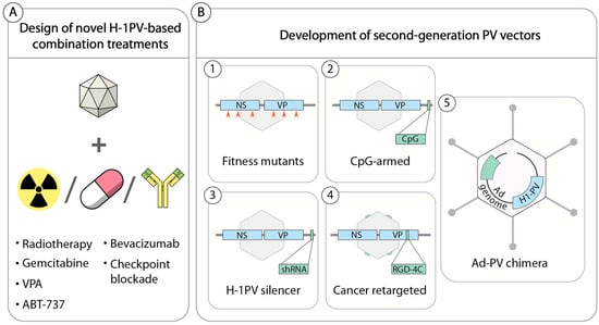 The strategies pursued thus far to improve the anticancer properties of H-1PV are listed below and summarized in Figure 3B.