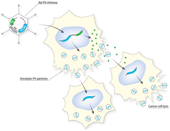 To combine the high titre and efficient gene transfer capacity of Ad with the anticancer potential of H-1PV (PV), an engineered version of the H-1PV genome was inserted into a replication-defective (E1- and E3-deleted) Ad5 vector genome to create an Ad–PV chimera [97]. The Ad carrier serves as a Trojan horse to bring the H-1PV genome into cancer cells, where the PV DNA is excised from the Ad backbone and autonomously initiates a genuine PV cycle, resulting in the production of PV particles. These PV particles retain the ability to infect neighbouring cancer cells, kill them, and induce secondary rounds of lytic infection, thereby amplifying the initial cytotoxic activity of the chimera (Figure 4). As a consequence, the Ad–PV chimera exerts stronger cytotoxic activities against various cancer cell lines than those of the PV and Ad parental viruses while still being innocuous to a panel of normal primary human cells. The Ad–PV chimera also offers the advantage of overcoming the limited cargo capacity of the PV. Indeed, the Ad backbone can accommodate therapeutic transgene(s) encoding pro-apoptotic or immunostimulating factors, whose activity may reinforce the anticancer effect of PV. Therefore, the chimera offers the advantage of combining in only one vector, effectors for both cancer gene therapy (non-propagating Ad-mediated delivery and expression of therapeutic transgenes in cancer cells) and oncolytic viro-immunotherapy (PV particles retaining oncolytic and anticancer adjuvant properties as well as the capacity for propagating in the tumor bed).