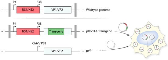 As reported above, protoparvoviruses have a limited packaging capacity. As a result, only small heterologous DNA sequences can be inserted in the parvoviral genome, without impairing the ability of the virus to self-propagate. Arming protoparvoviruses with larger transgenes is still possible by replacing a part of the VP gene unit with a therapeutic gene [95,98]. These recombinant PVs (recPVs) retain the NS1/2 coding sequences (controlled by the parvoviral P4 promoter) and the parvoviral genome telomeres, which are necessary for viral DNA amplification and packaging. Expression of the transgene is generally kept under control of the genuine parvoviral late promoter P38, whose activity is upregulated by NS1. Production of recPV takes place in producer cell lines upon co-transfection of the recombinant viral genome (containing the transgene) with a second plasmid harbouring the VP gene unit (Figure 5). The latter provides in trans the VP proteins needed for virus assembly, thus compensating for the disruption of the structural genes in the recombinant viral genome. The recombinant parvoviral particles generated in this way are DNA replication competent but propagation-defective and achieve transgene expression only in primarily infected cells as a one-hit event. The deletion of a portion of the structural genes gives the opportunity to insert transgenes up to approximately 1200 nt, while the insertion of larger transgenes strongly impairs virus production. Recombinant rodent parvoviruses have been constructed using MVM and H-1PV infectious plasmids as backbones. Examples of transgene products expressed by means of recombinant H-1PV vectors include pro-apoptotic apoptin [99], immunostimulatory cytokines/chemokines (e.g., human IL2, CCL7, and CCL2) [100], and antiangiogenic modulators (e.g., CXCL10 and CXCL4L1) [101,102]. Some of these recPVs are therapeutically promising, as they proved to have an enhanced anticancer activity in preclinical animal models. However, efficient production of these recombinants remains a major obstacle in their way to the clinic [98]. Co-transfection of the above helper system with a plasmid containing the adenoviral E2a, E4(orf6), and the VA RNA genes (e.g., pXX6 plasmid) improved the production of recPVs by more than 10-fold [91]. Based on these results, an Ad harbouring the VP gene unit was constructed and used as a helper. This VP expressing Ad further improved the recPV yields because it allowed cell lines that were difficult to transfect but efficient at producing recPVs (e.g., NB324K) to be used according to a protocol that relied entirely on virus infection [103]. Further research and development activities are worth conducting to optimize and scale-up recPV production.