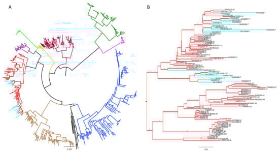 - Stamatakis, A. RAxML version 8: A tool for phylogenetic analysis and post-analysis of large phylogenies. Bioinformatics 2014, 30, 1312–1313. [Google Scholar] [CrossRef] [PubMed]