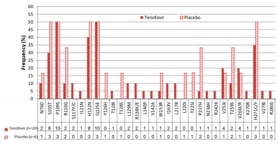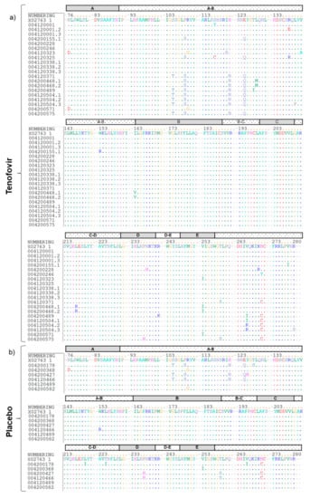 Amino acids 76 to 280 for each sequence were evaluated by their degree of codon polymorphisms and compared with the subtype A reference strain (X02763) to identify mutations in the HBV RT domain. The region analyzed included the five functional domains (A [aa75–91], B [aa163–189], C [aa200–210], D [aa230–241], and E [aa247–257]) and the four interdomains (A–B, B–C, C–D, and D–E). Amino acids for each sequence were evaluated by their degree of codon polymorphisms and compared with the genotype reference strain to identify naturally occurring mutations. The Fisher’s exact test was used to compare the frequency of mutations in the reverse transcriptase (rt) polymerase region in isolates from women in the tenofovir and placebo arms. Variability was classified as follows: conserved regions were defined as site showing variation ≤1%, low polymorphism (5–10% variability), intermediate polymorphism (15–30% variability), and high polymorphism (>50% variability).