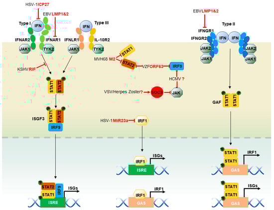 Interferons (IFNs) signal through the JAK-STAT pathway to induce antiviral gene expression (Figure 2). Type I (α and β), II (γ) and III (λ) IFNs bind to their cognate receptor complexes that often constitute a heterodimer. Both type I and type III IFNs signal by activating the Janus kinase 1 (JAK1) and the tyrosine kinase 2 (TYK2): type I IFNs act through heterodimers consisting of IFN-α receptor 1 (IFNAR1) and 2 (IFNAR2), whereas type III IFNs act through heterodimers composed of interleukin-10 receptor 2 (IL-10R2) and IFN-λ receptor 1 (IFNLR1). IFN-induced oligomerization of receptors results in the recruitment of JAK1 and TYK2, which auto-phosphorylates and further phosphorylates tyrosine residues within the intracellular carboxyl termini of the receptors [1]. Consequently, STAT1 and STAT2 are recruited to the IFN receptor complexes and phosphorylated. Phosphorylated STAT1 and STAT2 form a heterodimer that subsequently binds to IFN regulatory factor 9 (IRF9), constituting the ISG factor 3 (ISGF3) complex. In contrast, type II IFNs activate JAK1 and JAK2 through IFN-γ receptors 1 (IFNGR1) and 2 (IFNGR2) heterodimers, leading to the phosphorylation of both JAK1 and JAK2, and subsequent phosphorylation of receptor chains. STAT1 is phosphorylated by JAK1 and JAK2, which results in STAT1 homo-dimer known as the IFN-γ activation factor (GAF). Both ISGF3 and GAF translocate into the nucleus and bind to ISRE and GAS, respectively, to activate the transcription of ISGs [1]. Herpesviruses demonstrate different strategies to inhibit the JAK-STAT pathway stepwise, including the expression of IFN receptors, binding with receptors, the phosphorylation of JAK and STATs and the expression of STATs and IRF9 [159,160]. EBV-latent membrane protein LMP2A and LMP2B mediate degradation of IFNAR1 and IFNGR1 in an unknown mechanism [161]. Similarly, MHV68 M2 protein downregulates STAT1 and STAT2, resulting in inhibition of the IFN-mediated transcriptional activation [162]. EBV immediate-early protein, BZLF1, decreases expression of the IFNGR1 receptor, coupling with inhibition of STAT1 tyrosine phosphorylation and nuclear translocation upon induction [163]. HSV-1 ICP27 induces the secretion of type I IFN antagonizing protein, which competes with type I IFN receptors to bind IFNs, leading to impaired IFN signaling [164]. KSHV (ORF10) (named RIF) interacts with JAK1, TYK2, and STAT2 to form an inhibitory complex of a type I IFN signal, thus attenuating JAK1 and TYK2 activities, phosphorylation of both STAT2 and STAT1, and formation of the ISGF3 transcriptional cofactor [165]. VZV and herpes zoster up-regulates cellular IFN-stimulated suppressor of cytokine signaling (SOCS) proteins, JAK kinase inhibitors, to inhibit the JAK-STAT pathway [166], although HCMV reduces IRF9 and JAK1 expression, with no viral factors identified in these capacities [167]. VZV ORF63 inhibits IRF9 expression and STAT2 phosphorylation [168], although the mechanisms remain unknown.