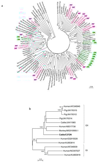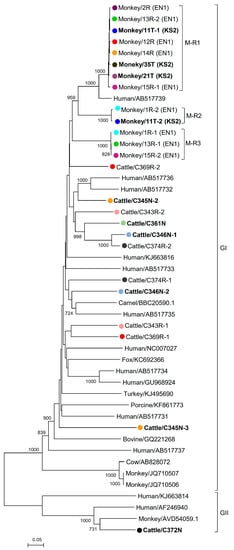 Multiple strains of PBV were present in the respiratory samples of monkeys and cattle. Up until early 2019, although PBVs have been found in different animal species [,,,,,,,,,,,,,,,,,,], more than one strain of PBV has only been described in alimentary samples collected from humans [,], pigs [,], chickens [], monkeys [], and buffalos []. In our recent study, multiple strains of PBV were observed in the same alimentary samples of cattle, monkeys, horses, pigs, and California sea lions []. In the present study, among the three monkeys and four cattle positive for PBVs in their respiratory samples, more than one strain of PBV was present in two cattle and one monkey, as confirmed by RdRp gene sequencing. This phenomenon of multiple strains of PBV in one respiratory sample has been reported in pigs, from which both genogroups I and II PBVs were observed in the same sample [].