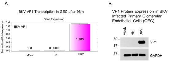 3.7. BKV Infected Glomerular Endothelial Cells Express High Levels of VP1 Transcripts and VP1 Protein