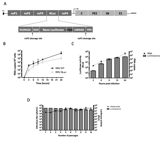 The full cDNA clone of RRV T48 strain (GenBank accession number GQ433359) was obtained from R. Kuhn’s laboratory [31]. In order to generate a recombinant RRV virus expressing NanoLuc, we used a strategy previously developed in our laboratory [32,33]. The NanoLuc gene (NLuc) was inserted in the non-structural open reading frame (ORF) of the viral genome, between the nsP3 and nsP4 genes, flanked by two nsP2 cleavage sites. Thus, NLuc is expressed in the non-structural polyprotein during viral replication and released after nsP2 cleavage. The full sequence of RRV-NLuc was submitted to GenBank.