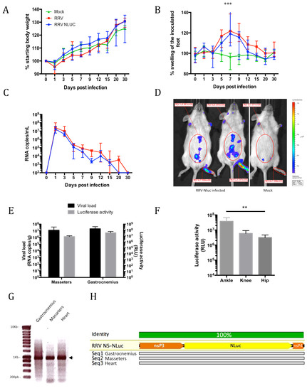 Experimental infections of immunocompetent albino mice with RRV-NLuc and the native RRV-T48. Mice were inoculated with 106 pfu of RRV-NLuc (blue) or native RRV (red) or diluent alone (green), then monitored for the indicated parameters. Each data point is the mean ± SEM of four mice and is representative of two independent experiments. (A) Body weight gain (%); (B) swelling of the inoculated foot (*** = p < 0.001, two way ANOVA); (C) viremia in peripheral blood; (D) in vivo imaging of RRV-NLuc at 1 dpi, a high bioluminescent signal is observed in the inoculated foot; (E) assessment of viral load (RNA/g) and luciferase activity (RLU) in the masseters and gastrocnemius muscles at 6 dpi; (F) luciferase activity (RLU) in the joints of the inoculated limb (p = 0.005, Kruskal-Wallis); (G) electrophoresis of PCR products from total RNA extracted from gastrocnemius, masseter and cardiac muscles at 6 dpi. The amplified fragment, indicated by the arrow, contains the NLuc insert flanked by parts of nsP3 and nsP4 (expected size 950 bp); (H) alignment of the nsP3-nsP4 region with the NLuc insert (designed with Geneious software, Biomatters), the sequences shown were obtained 6 dpi from gastrocnemius, masseter and cardiac muscles, the insertion is present and no mutations were observed compared to the RRV-NLuc reference (data representative of three animals).