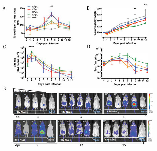 To characterize viral dissemination and tropism in vivo, we infected mice with low doses (103 and 104 pfu) or high doses (105 and 106 pfu) of RRV-NLuc. Disease signs, weight gain and viremia were monitored, and mice were imaged during the acute phase of RRVD.