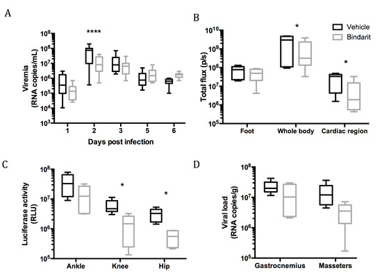 Since we validated this model for the study of RRVD, we chose to investigate the role of macrophages. These cells are known to play a central role in the pathogenesis of arthritogenic alphaviral disease [37]. To study their role in real time in vivo and evaluate an anti-inflammatory therapeutic strategy, we treated mice with Bindarit, an anti-inflammatory small molecule that acts through inhibition of the monocytes chemoattractant proteins (MCPs). We infected mice 6 h after the first administration of the drug with a dose of 103 pfu of RRV-NLuc and monitored the viral dissemination across five days. We observed a significant reduction in the viremia at 2 dpi in the Bindarit treated group when compared to the vehicle treated group (p < 0.0001, two way ANOVA; Figure 4a). When measuring the in vivo bioluminescence in the infected animals, we observed no significant difference between the Bindarit and vehicle treated animals in the inoculated feet suggesting no local effect of macrophage inhibition at the site of inoculation. To observe the potential effect of Bindarit treatment on dissemination from the foot to the rest of the body, we quantified the bioluminescence in the whole mouse body (Supplementary Figure S2). At 1 and 3 dpi, no significant difference was observed between the treated and control groups. However, at 5 dpi, the treated mice exhibited a lower bioluminescent signal then the control group (p = 0.03, two way ANOVA). When examining a distant site, like the cardiac region, we observed the same trend with no difference upon treatment at 1 and 3 dpi and a lower signal at 5 dpi (p = 0.02, two way ANOVA; Figure 4 and Figure S2). To further investigate the consequences of the Bindarit treatment on the viral dissemination, animals were sacrificed on 6 dpi and different organs were collected for ex vivo evaluation of luciferase activity and viral load. First, we measured the bioluminescent signal and did not observe any reduction in signal in the ankle joints upon treatment (Figure 4c). However, in remote joints, such as the knee and hip joints, we observed a reduction in the luciferase activity in the treated group when compared to the vehicle treated group (p < 0.05, two way ANOVA; Figure 4c). This trend was also observed in the muscles; the reduction in viral burden was more pronounced in locations further from the inoculation site, such as the masseters (Figure 4d and Figure S2d).